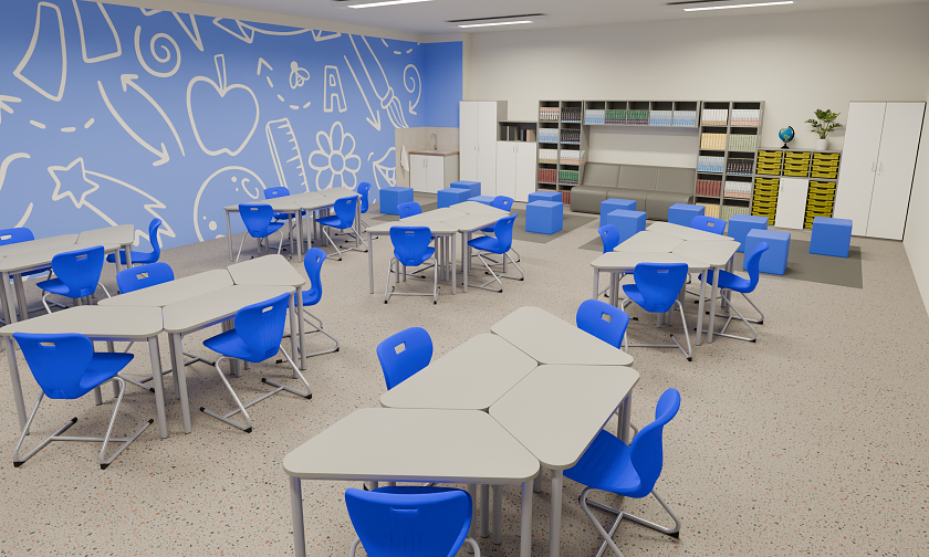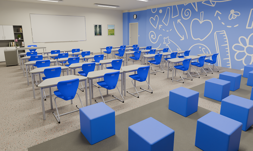 Schulklasse oder Klassenzimmer mit Tischen für variable Nutzung